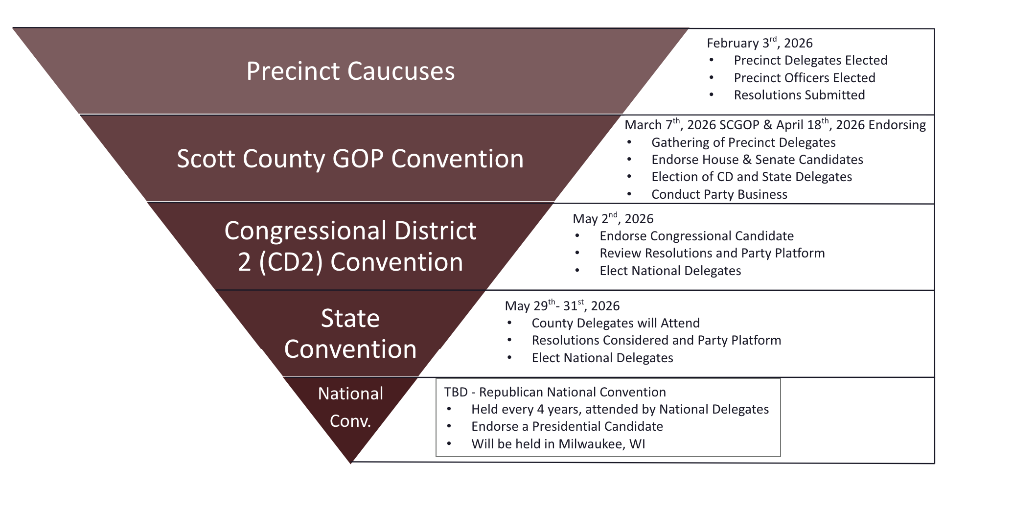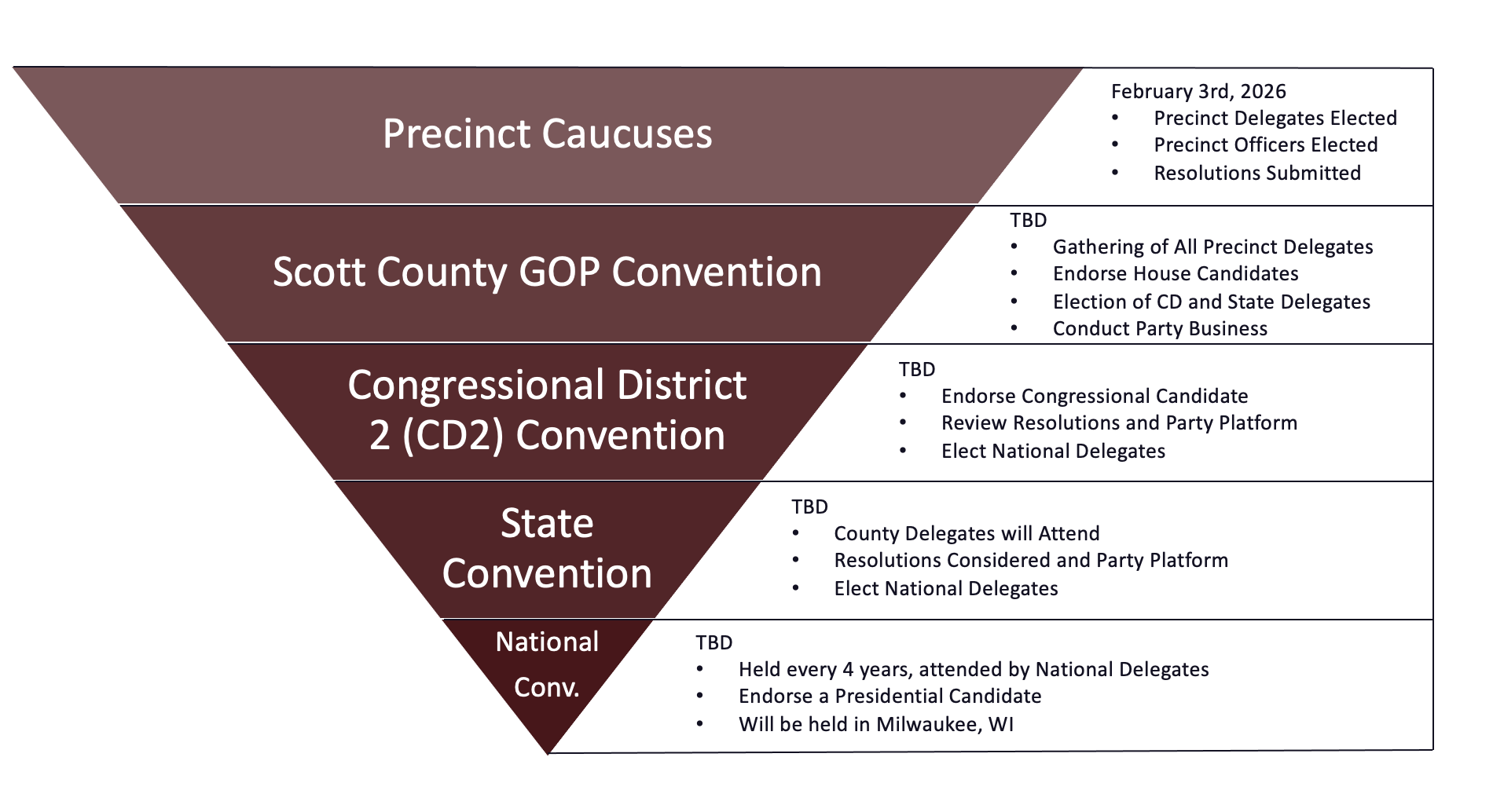 Precinct caucuses will be held on February 3rd, 2026. These will be held at various locations around Scott County. Please check back in early February for location information. Announcements may be found on local and state websites, social media, and in local newspapers to inform the public of caucus locations.
